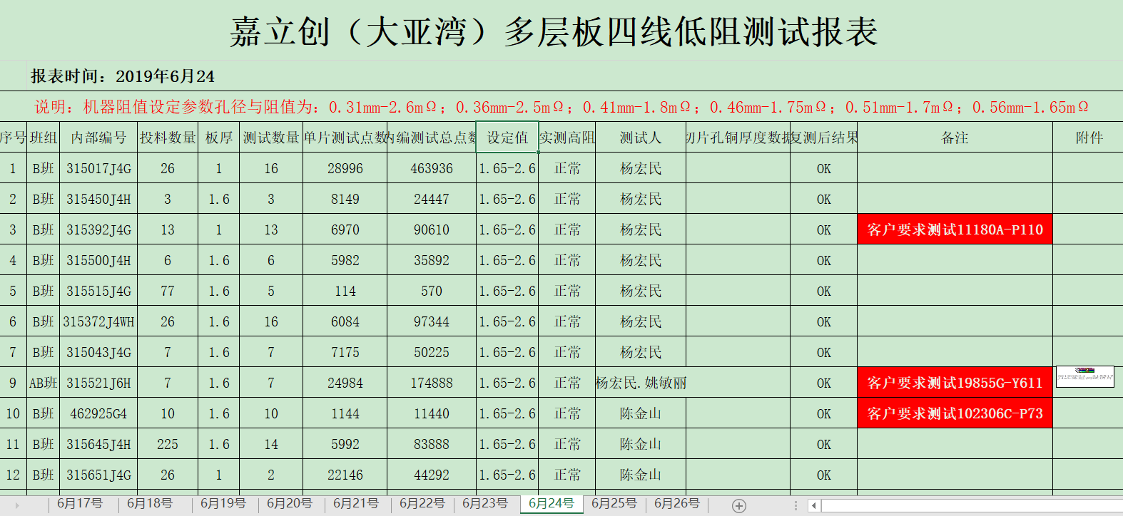四:批量性四線低阻管控: 嘉立創(chuàng)工廠每天四線低阻測(cè)試管控記錄報(bào)告: