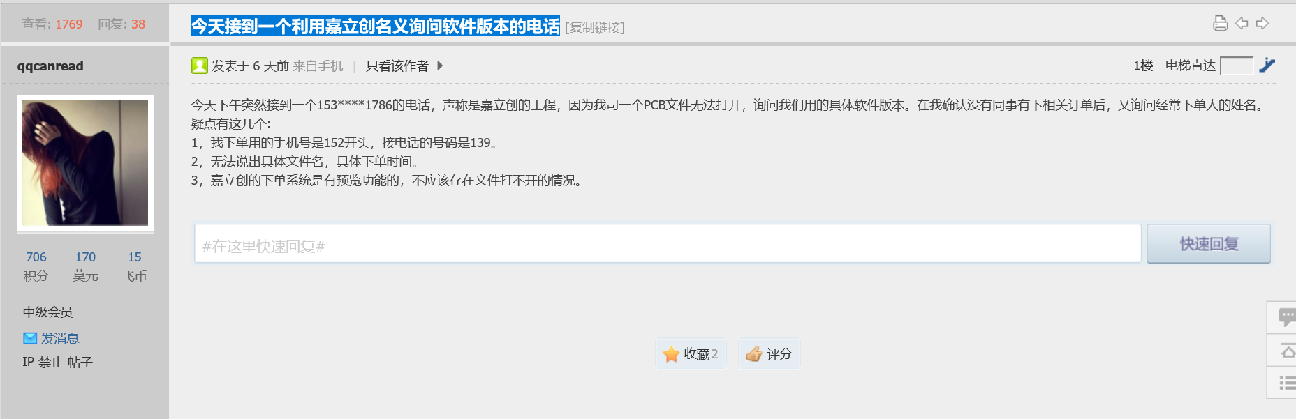 接到一個19129987405的,說是嘉立創(chuàng)的,說了四五個同事的姓名,問我是不是兩層板居多,用什么工具,我說cadence,然后又問AD和protel用不用,我說版權問題不用了,后來要領導電話號碼,我覺得不對勁了,問他到底是哪里的,為啥要這些信息,說是之前登記信息不全,我說投板老板根本不管,都是工程師的事,要領導信息干嘛,她來了句“哦,是啊”。