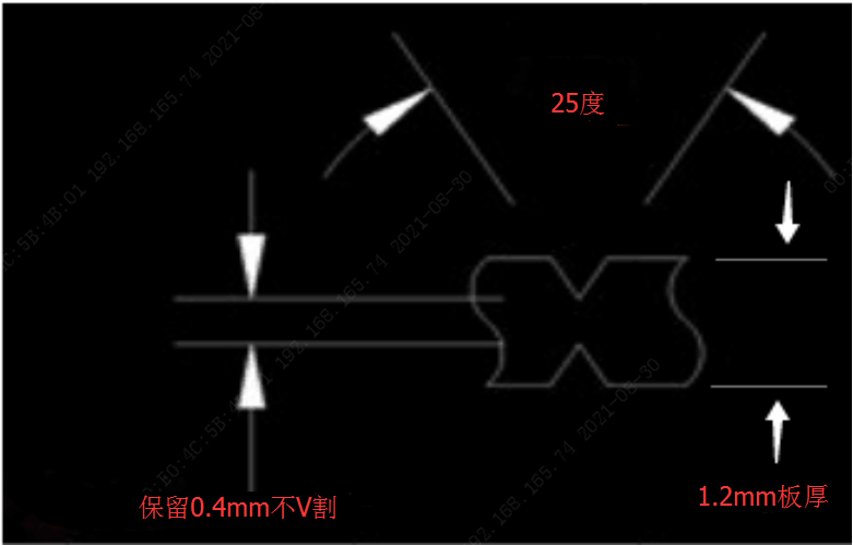 嘉立創(chuàng)V割一律采用1/3余厚,一面V-CUT掉1/3,即V板厚的2/3,留1/3,33.3%(+/-0.1mm),V割角度:25度