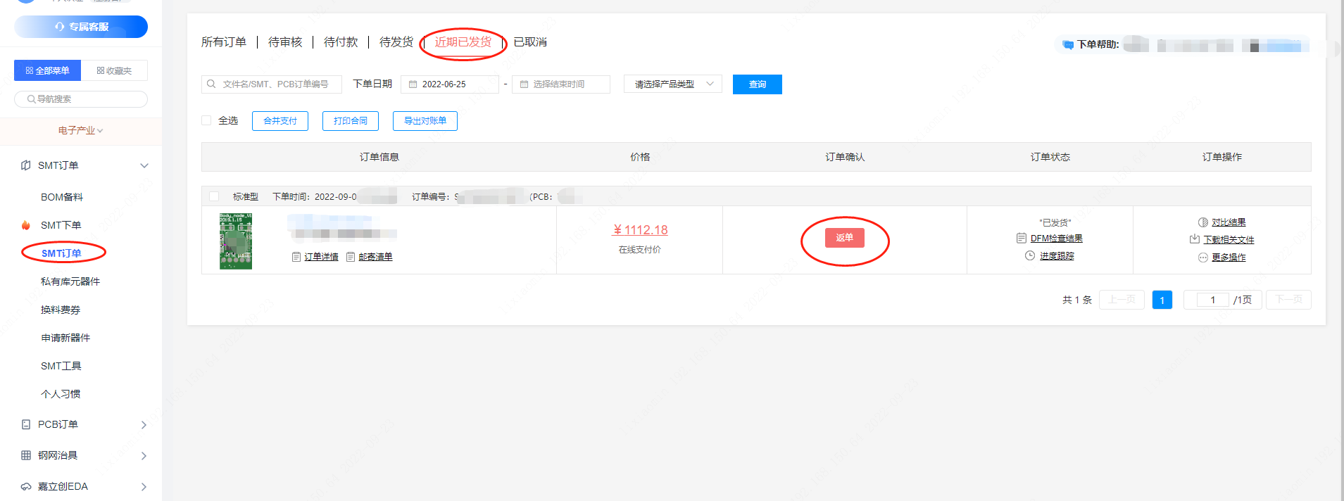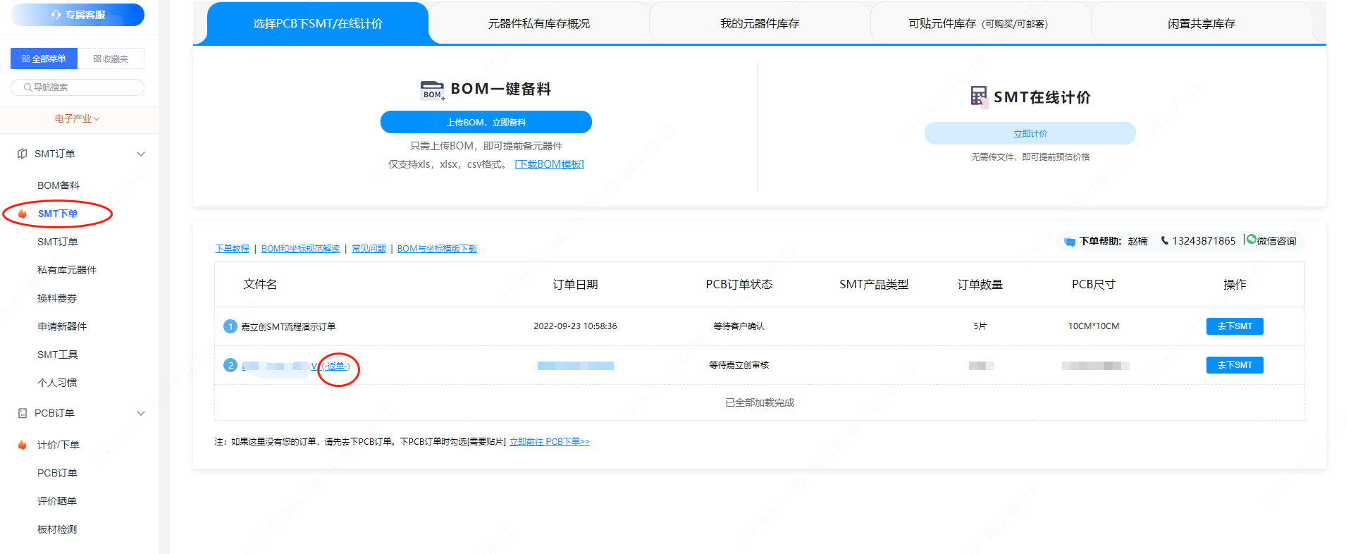 第三步:在PCB提交訂單后,在【SMT下單】的菜單內(nèi)會體現(xiàn)出來需要返單的SMT訂單,如圖所示在文件名后面會帶有“返單”字樣。