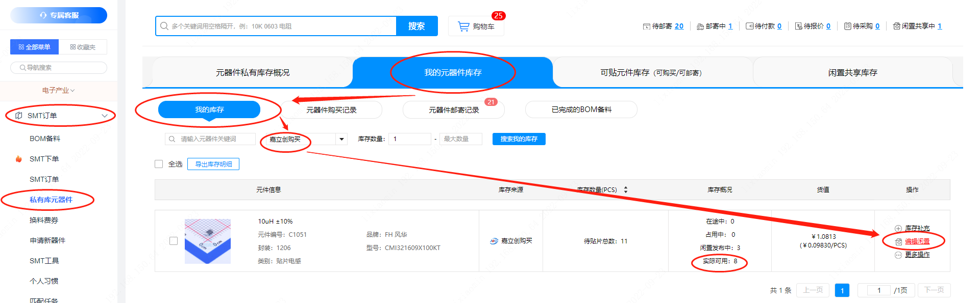 第一步:在【私有庫元器件】--【我的元器件庫存】--【我的庫存】內(nèi)“庫存來源”處選“嘉立創(chuàng)購買”后可以查看庫存總數(shù)。如有多出可點(diǎn)擊“編輯閑置”按鈕。