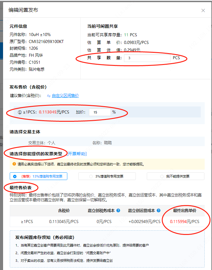 第二步:點(diǎn)擊后會(huì)顯示編輯閑置發(fā)布頁面框,可以看到器件參數(shù)等信息,您輸入共享數(shù)量、加價(jià)比,并選擇您能提供的發(fā)票類型(選擇后會(huì)出現(xiàn)最終出售單價(jià)),閱讀《發(fā)布閑置庫存須知》并勾選,而后點(diǎn)擊“確定發(fā)布”。