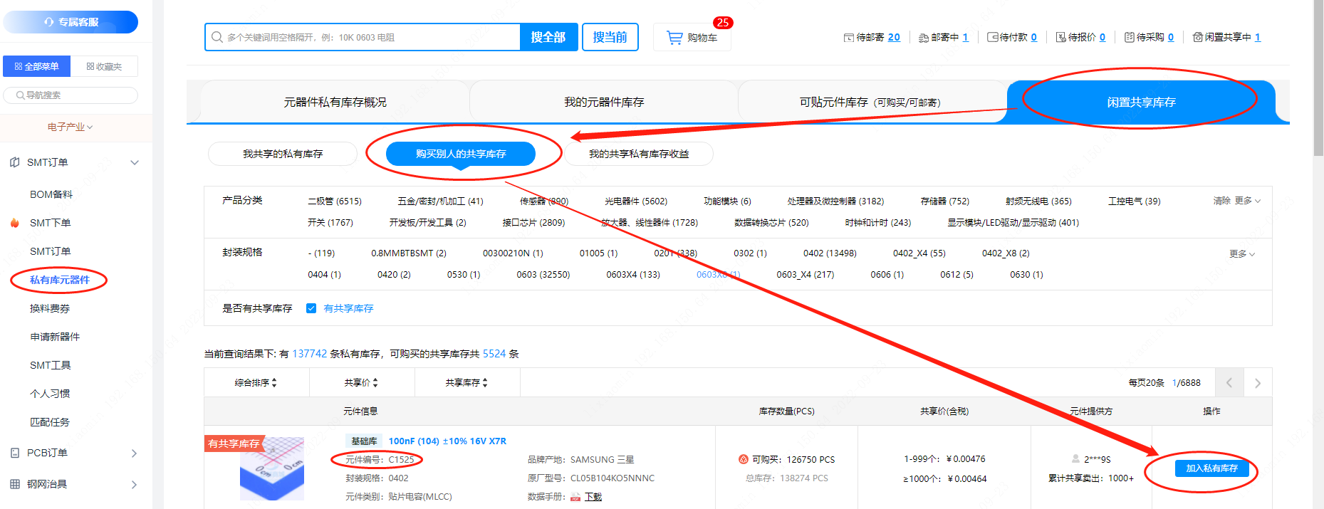 點(diǎn)擊【私有庫元器件】--【閑置共享庫存】--【購買別人的共享庫存】,找到您需要的器件,點(diǎn)擊“加入私有庫存”即可。