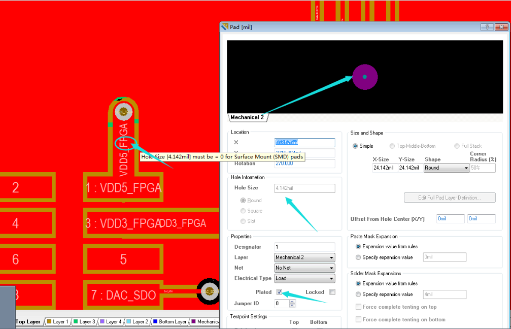 習慣使用AD20軟件的老童鞋們,貌似布線太隨意,Mechaical 2層放置(焊盤孔),因高板本兼容性問題導致電源和地線全部短路.(低版本可杜絕此問題)如下圖: