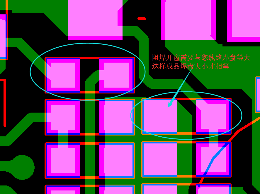 另一種情況開窗區(qū)域內(nèi)有線路或銅皮的,會(huì)露出來跟焊盤鏈接在一起,這樣會(huì)比沒有線路或銅皮鏈接的獨(dú)立焊盤端多出了一部分露銅部分,成品做出來看上去會(huì)有長(zhǎng)短不齊的現(xiàn)象,其實(shí)這些都是您阻焊開窗布線要考慮到的。