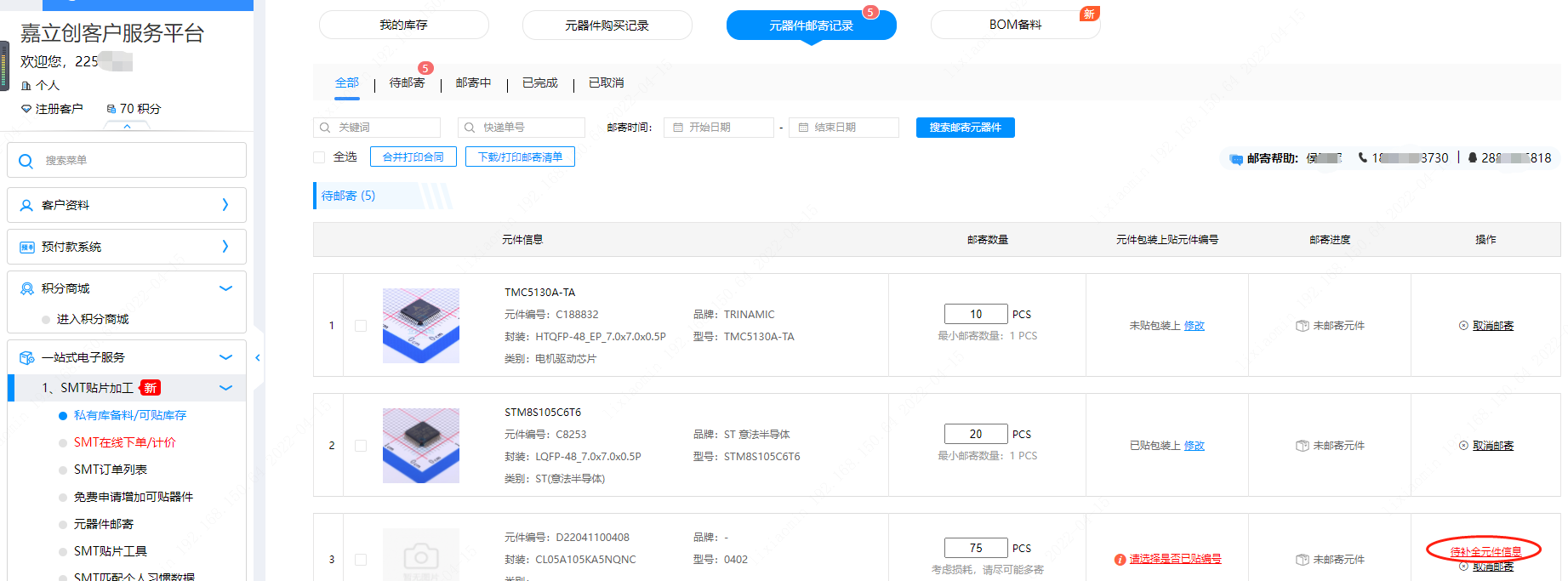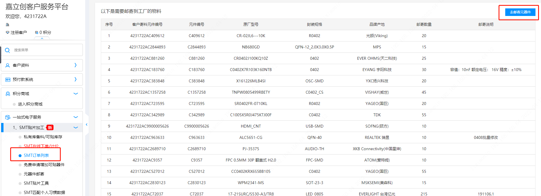 第八步:如圖所示在貼片加工菜單下點(diǎn)開【SMT訂單列表】菜單,在屏幕上方可以看需要郵寄的器件清單,點(diǎn)【去郵寄元器件】的按鈕即可。