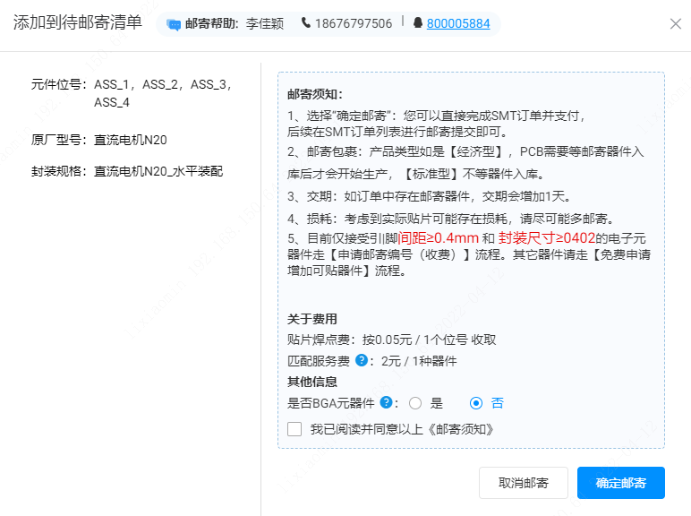 第十步:點(diǎn)完后會彈出確認(rèn)郵寄元器件清單頁面,這個(gè)頁面需要您下好快遞(記得在每個(gè)需要郵寄的器件包裝袋上寫好器件編號),下好后回來填好【快遞單號】、【郵寄聯(lián)系人】,閱讀并勾選發(fā)貨注意事項(xiàng)。