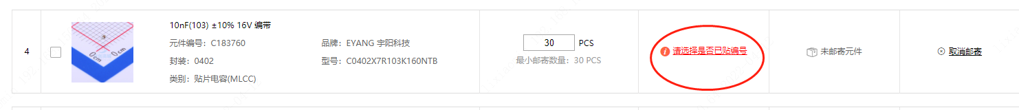 第一步:在下SMT訂單選器件界面,未匹配到型號的器件,可以直接郵寄,可以點(diǎn)【申請郵寄編號(收費(fèi))】