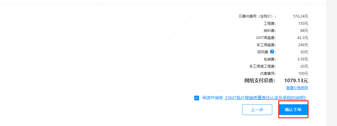 第七步:核對好后,點(diǎn)【確認(rèn)下單】,點(diǎn)完后系統(tǒng)會自動跳回主頁,這樣需要郵寄的器件才算真正加入到【待郵寄】清單里,未下單的話,需要郵寄的器件不會顯示出來。(若您屬于標(biāo)準(zhǔn)型號的訂單,將不再等郵寄器件入庫。PCB資料與SMT工程資料做好后,即可安排生產(chǎn)。)