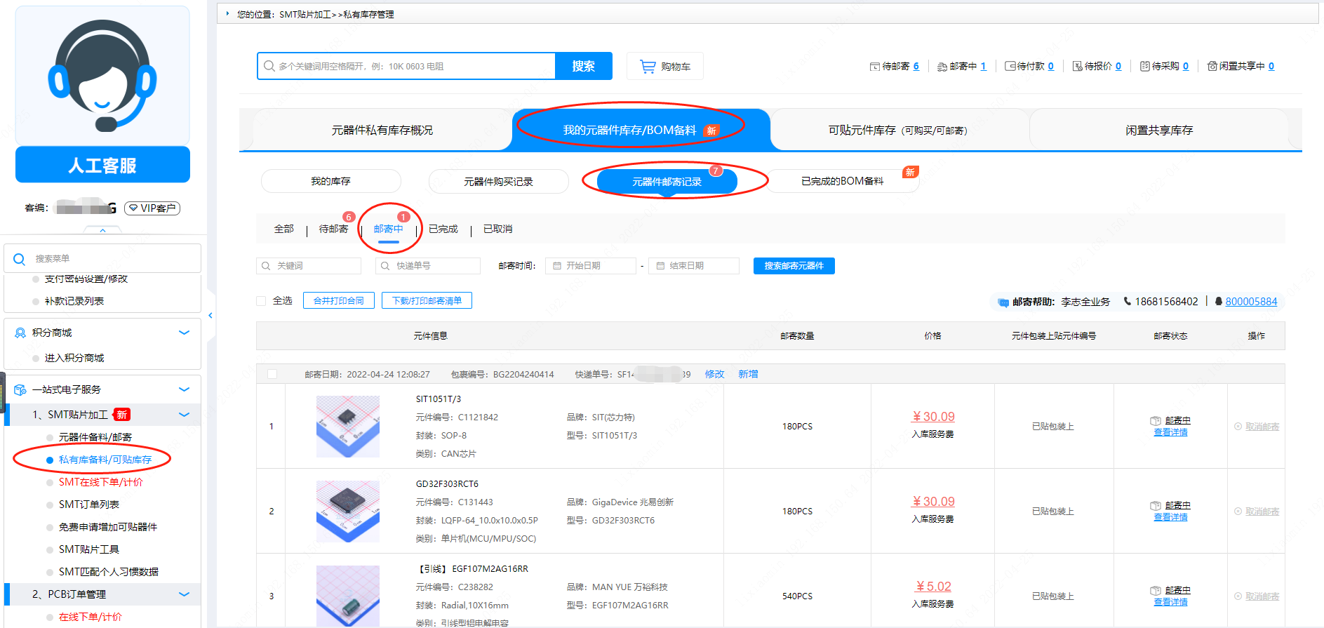 在【私有庫備料/可貼庫存】的菜單中,點(diǎn)“我有元器件庫存/BOM備料”字樣,再點(diǎn)擊【元件郵寄記錄】,可以看到郵寄的各種狀態(tài)。在【郵寄中】的狀態(tài)可以“修改”或者“新增”快遞號信息。