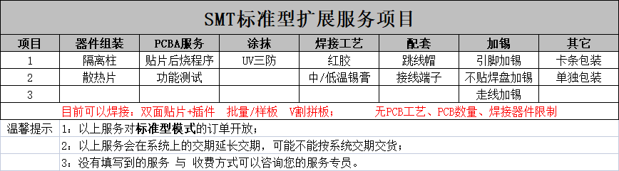 你們好!感謝大家對嘉立創(chuàng)貼片焊接的支持。為了能更好、更專業(yè)的服務(wù)您,近期我司新增加了關(guān)于標準型線下服務(wù)加工項目。目前具體可做的項目如下圖: