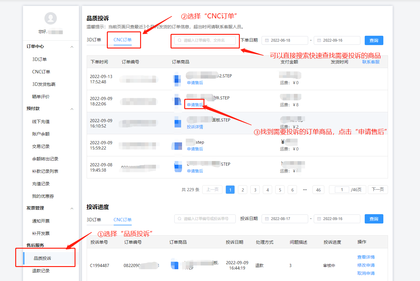 登錄進(jìn)入三維猴個(gè)人中心后,點(diǎn)擊 售后服務(wù) - 品質(zhì)投訴,并切換到cnc訂單,選擇需要投訴的商品并點(diǎn)擊“申請(qǐng)售后”;