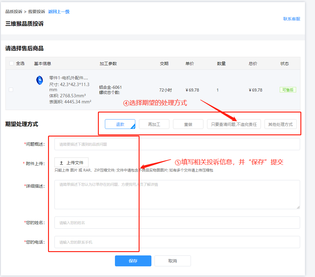 選擇 需要投訴的商品 和 期望處理方式 后,填寫對(duì)應(yīng)投訴信息并保存提交;