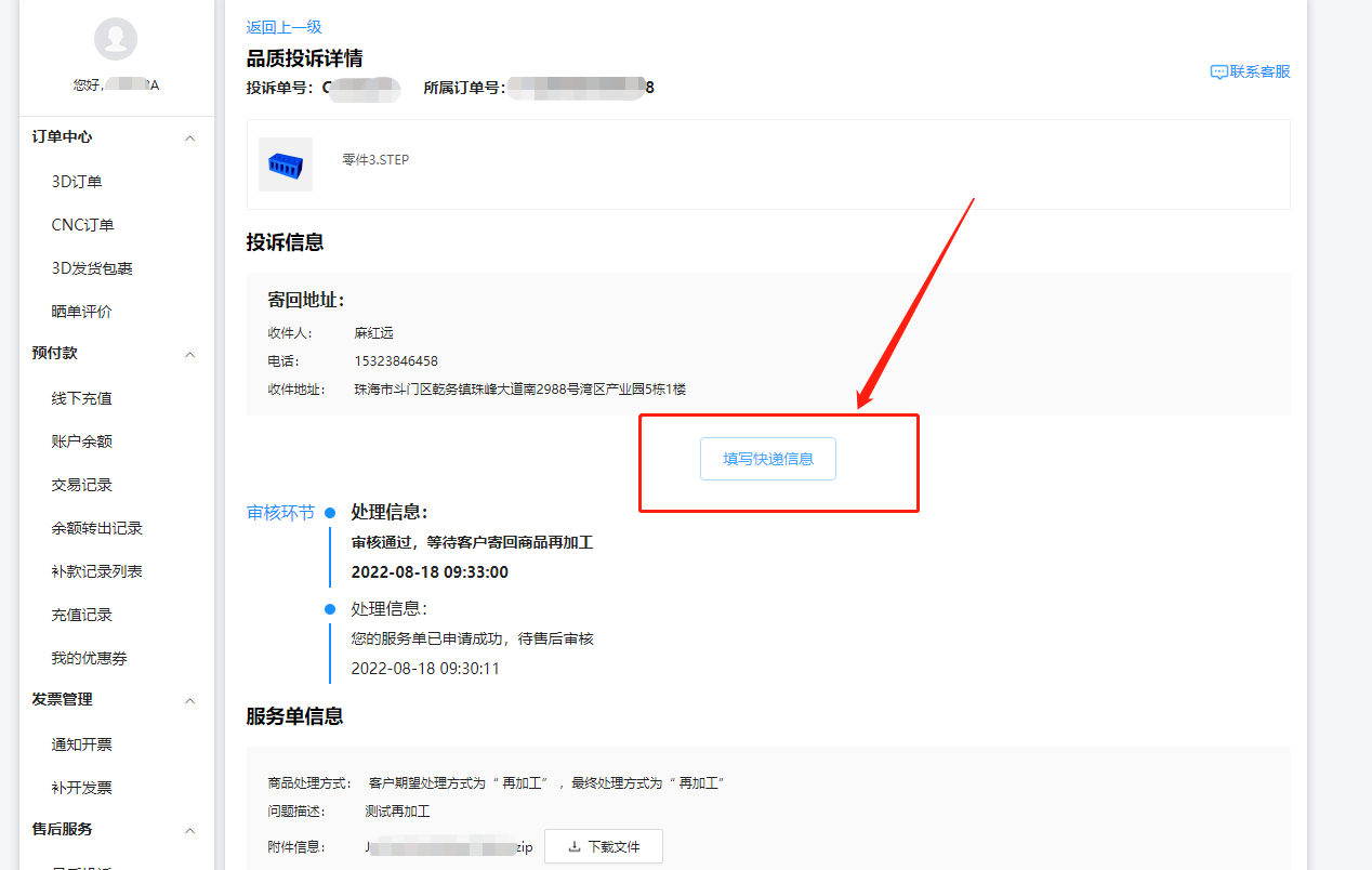 針對(duì)“再加工”的投訴單,審核通過(guò)后請(qǐng)務(wù)必在系統(tǒng)上填寫對(duì)應(yīng)快遞單號(hào),并用紙條寫明對(duì)應(yīng)訂單號(hào)、投訴單號(hào)及品質(zhì)異常原因,隨工件一起寄出,否則系統(tǒng)將無(wú)法進(jìn)行再加工處理!!