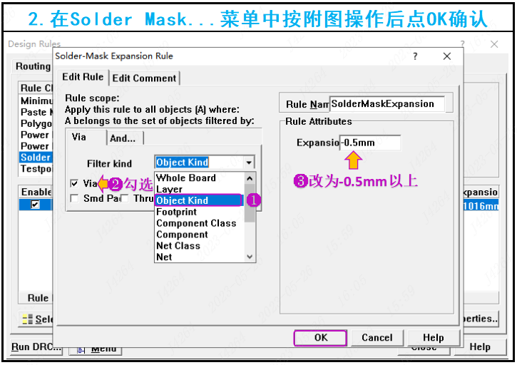 2. 在Solder-Mask Expansion Rule菜單中按圖示操作處理,就完成了所有過孔蓋油的操作了