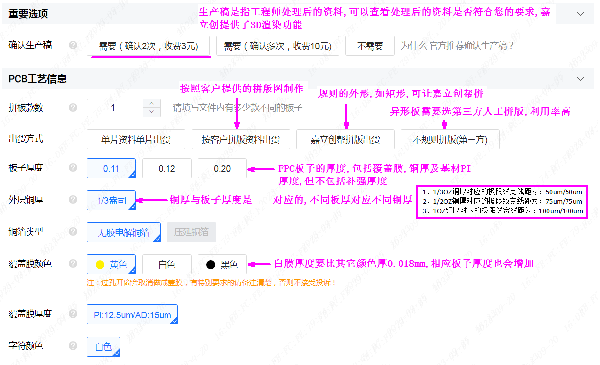 11.審核后可以付款,生產(chǎn)稿完成后需要確認生產(chǎn)稿,然后等板子到手就可以了。需要拼版的板,做SMT的話,需要等PCB審核后才能下SMT。提交訂單后建議關(guān)注【嘉立創(chuàng)FPC】公眾號,可隨時查看生產(chǎn)進度信息。