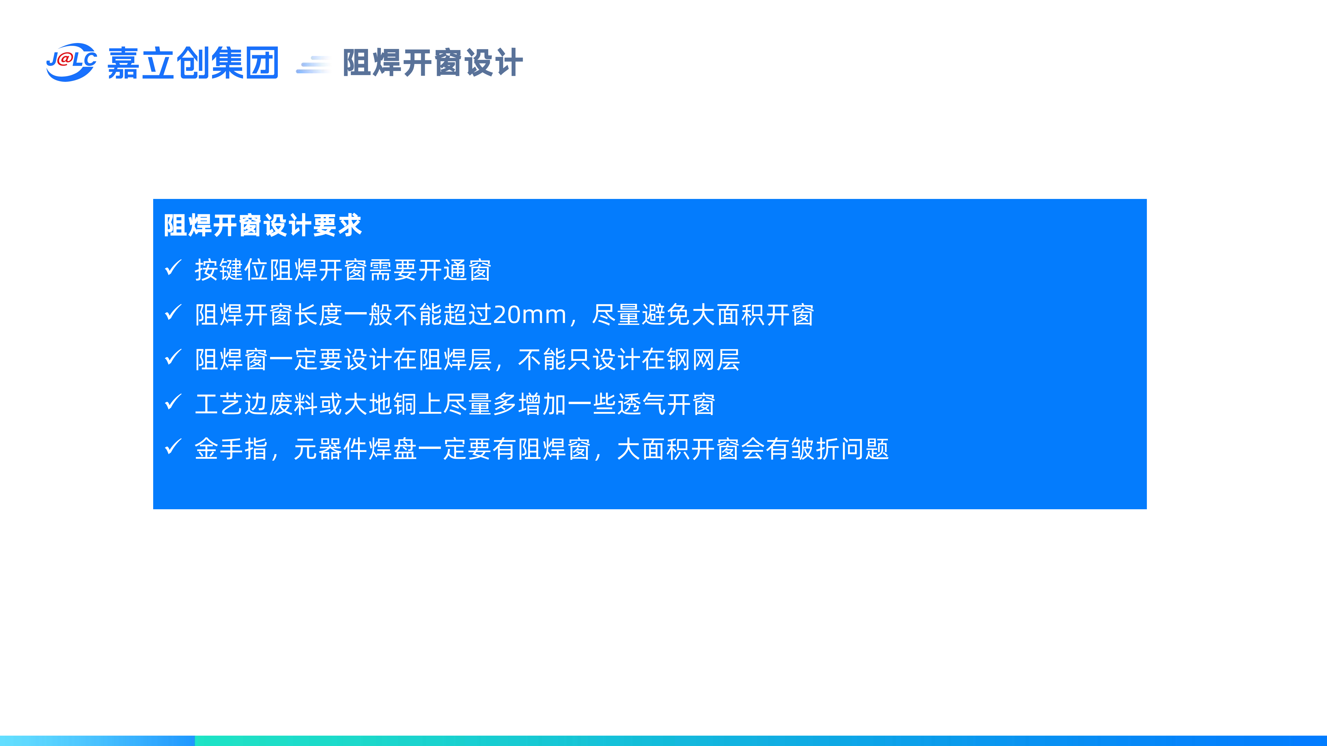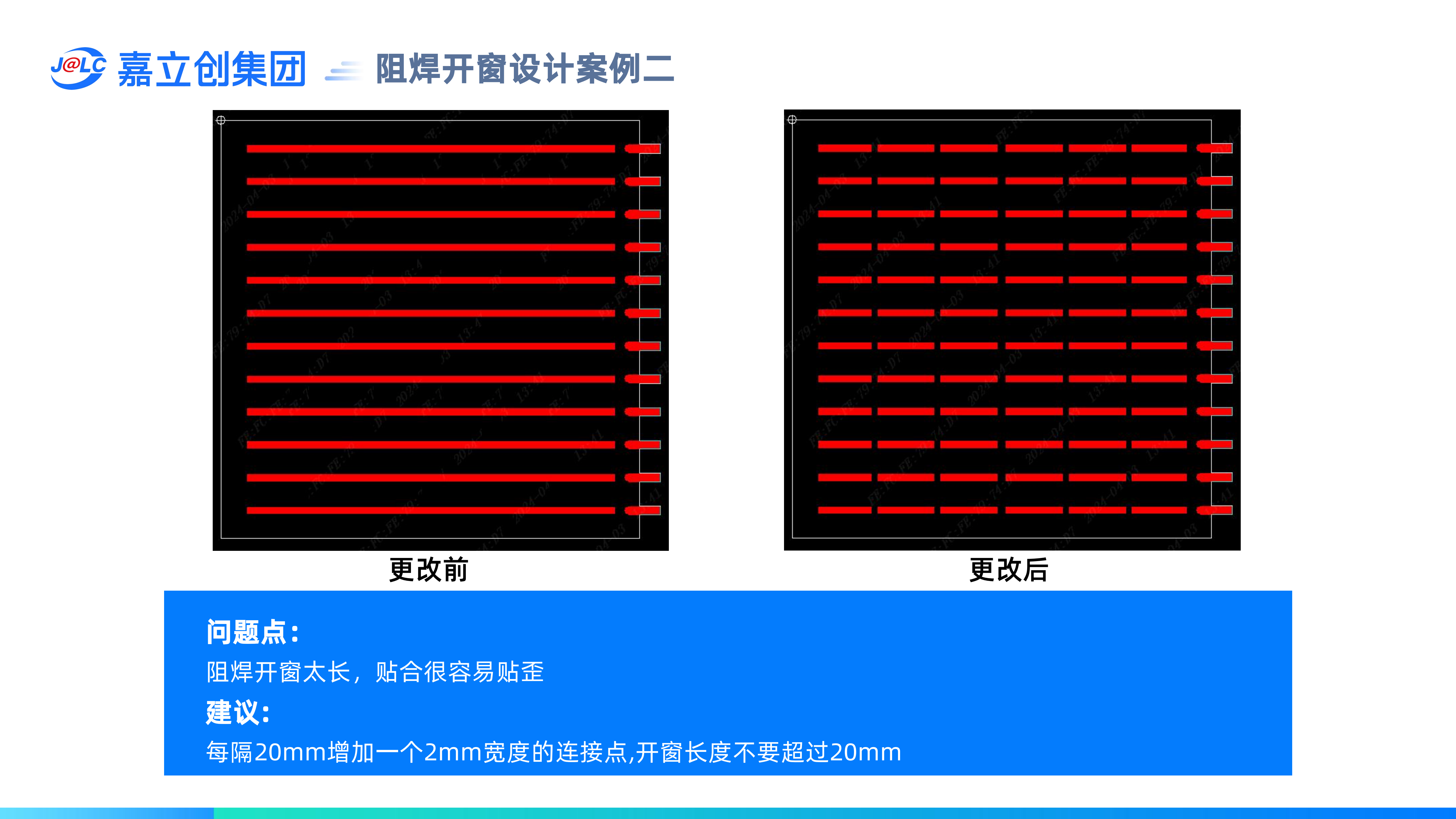 2.阻焊開窗長(zhǎng)度一般不能超過20mm,盡量避免大面積開窗;